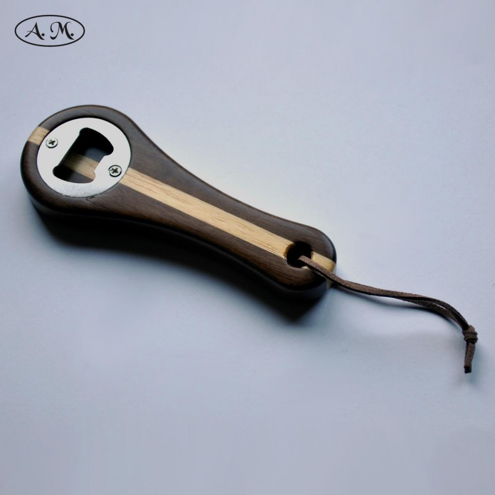 Practical handheld bottle opener to remove the cap from the bottles. Made of natural mansonia and koto wood.