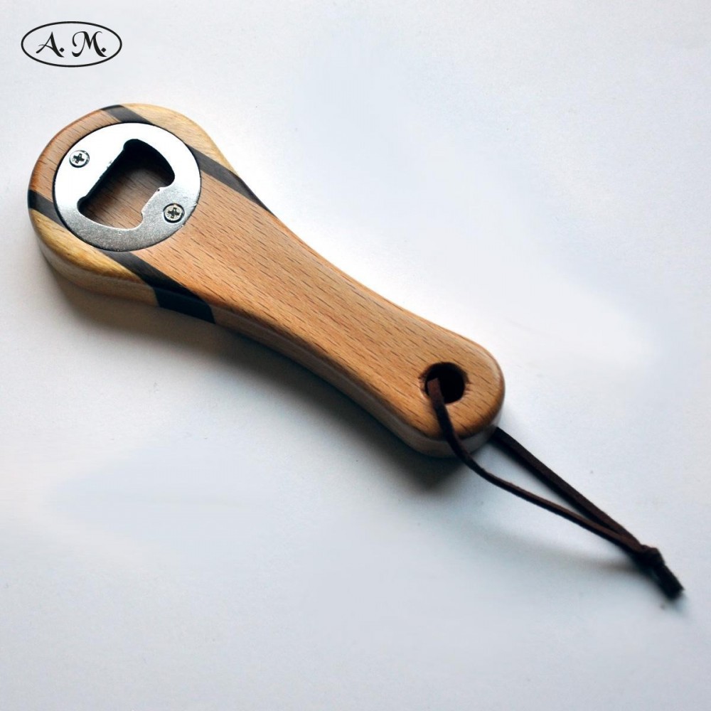 Practical handheld bottle opener to remove the cap from the bottles. Made of natural beech, mansonia and koto wood.