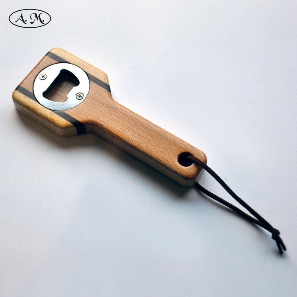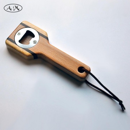 Practical handheld bottle opener to remove the cap from the bottles. Made of natural beech, mansonia and koto wood.