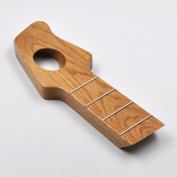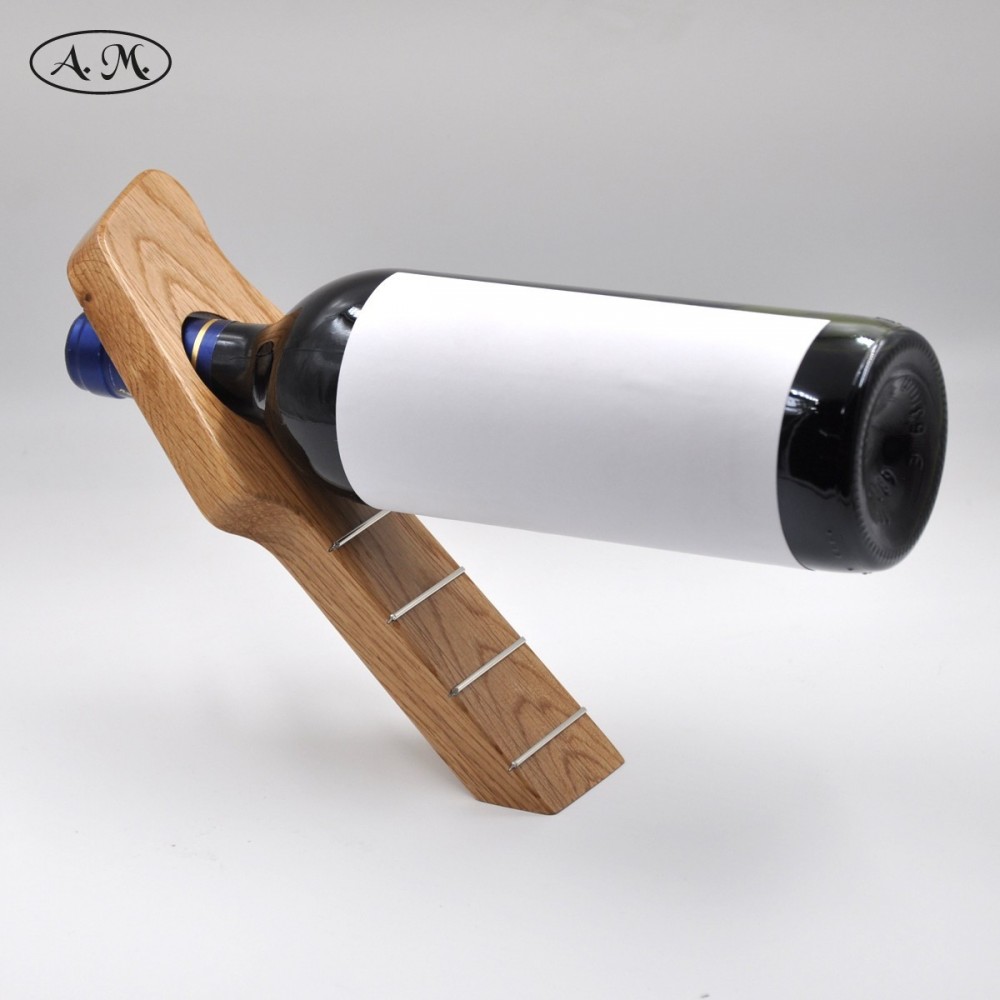 Balance bottle holder in the shape of the neck and headstock of a guitar. Made with natural oak wood and metal guitar frets.