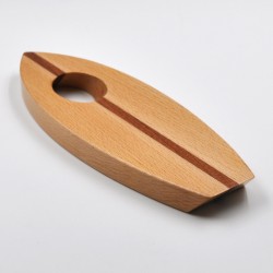 Handmade bottle holder made of natural beech and sapele wood and with capacity for a bottle of wine. Design that imitates a surfboard. Varnished finish.