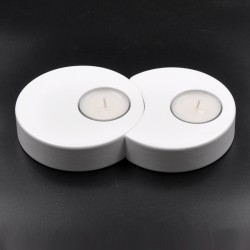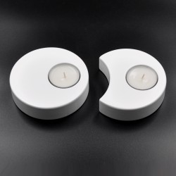 Candle holder in the shape of two nested circles. Made of fiber board, with lacquered finish.