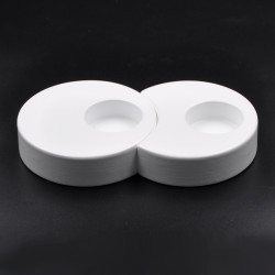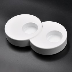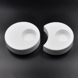 It consists of two independent pieces. One with a completely circular shape of approximately 100mm in diameter and 25mm thick, and another with circular shape with a hole to fit with the other, approximately 85x100x25mm in size.