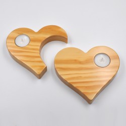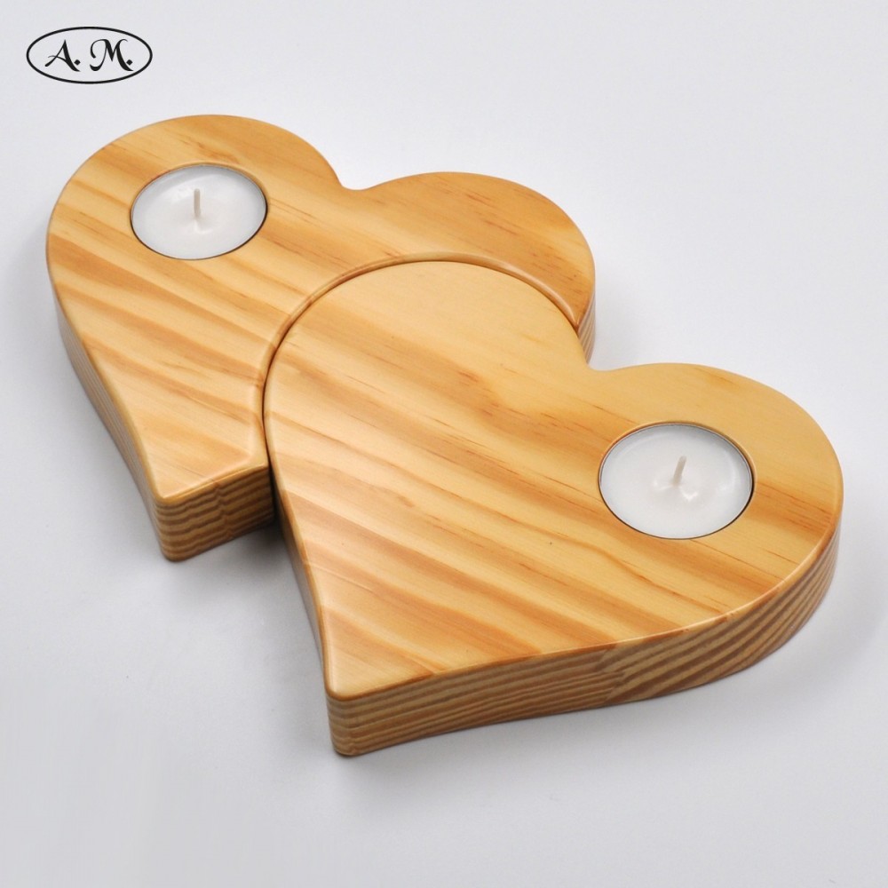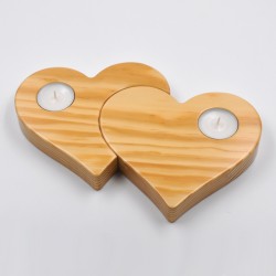 Handmade candle holder manufactured with natural pine wood. Design of two nested hearts. Varnished finish.