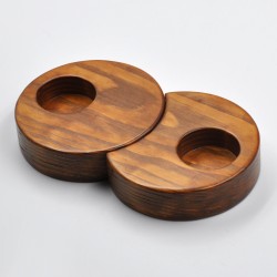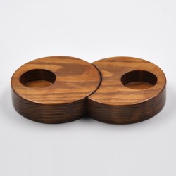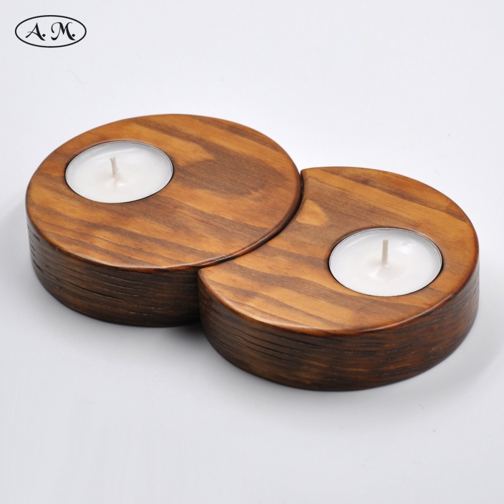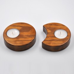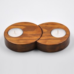 Handmade candle holder manufactured with natural pine wood stained in walnut color. Design of two nested circles. Varnished finish.