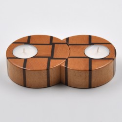 Handmade candle holder manufactured with natural beech and mansonia wood end-grain. Design of two nested circles. Varnished finish.