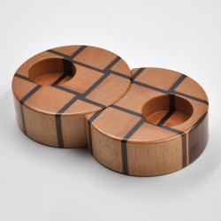 Candle holder in the shape of two nested circles. Made of natural beech and mansonia wood end-grain.