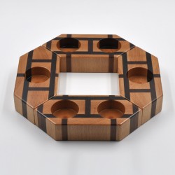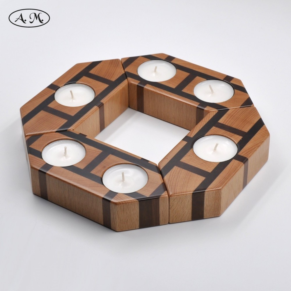 Handmade candle holder manufactured with natural beech and mansonia wood end-grain. Varnished finish.