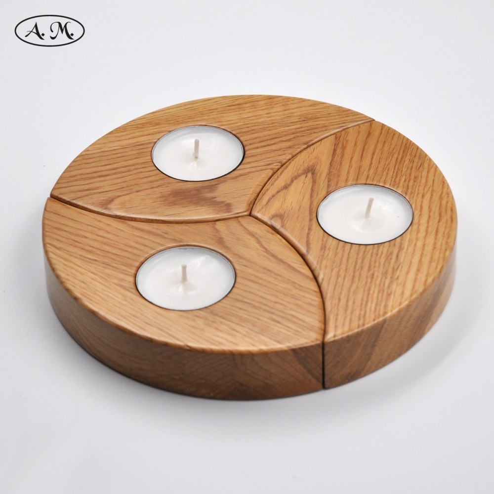 Handmade candle holder manufactured with natural oak wood. Detachable circular design. Varnished finish.