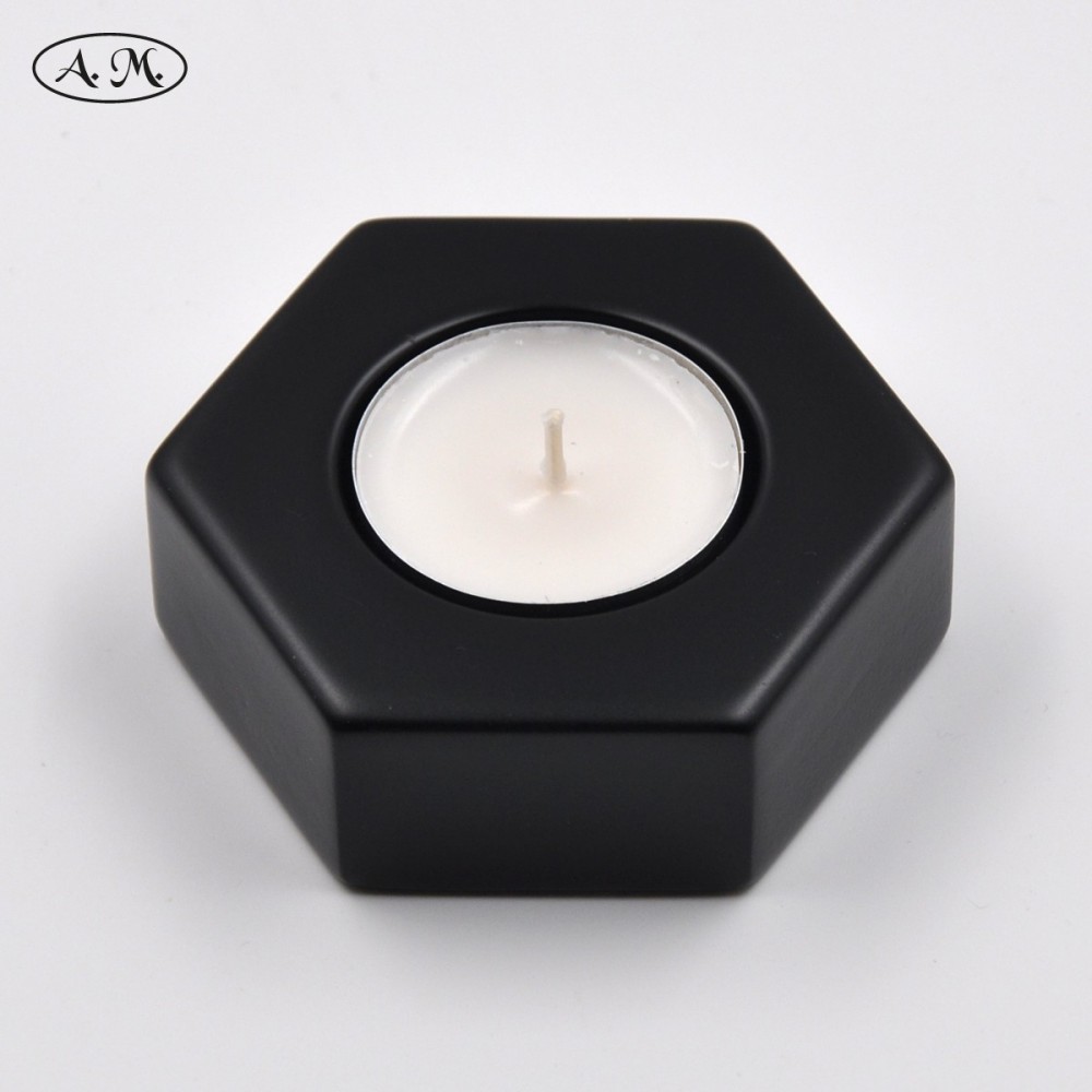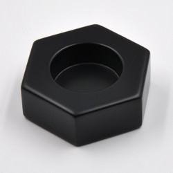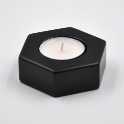 80mm wide hexagon shaped candle holder. Made of fiber board, with lacquered finish.