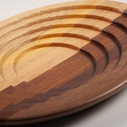 Oval shaped catch-all tray with Tessellation design. Made of natural ash, koto, birch, beech, sapele, iroko, dibetou and mansonia.
