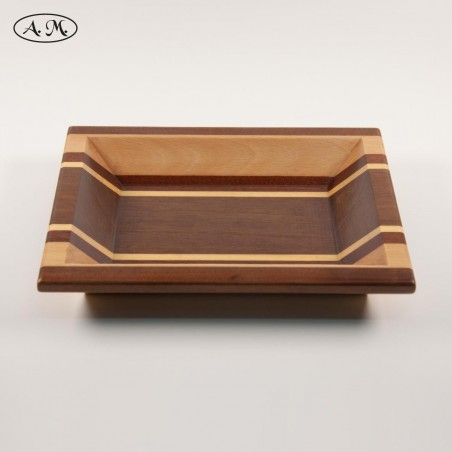 Catch-all tray made by hand in natural dibetou, beech, sapele, koto and mansonia wood. Rectangular shape. Varnished finish.