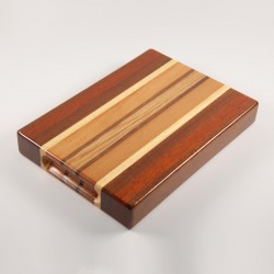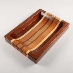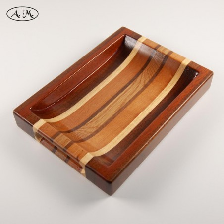 Rectangular shaped catch-all tray with finger slots. Made of natural dibetou, cedar, koto, beech, mansonia and oak.