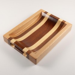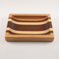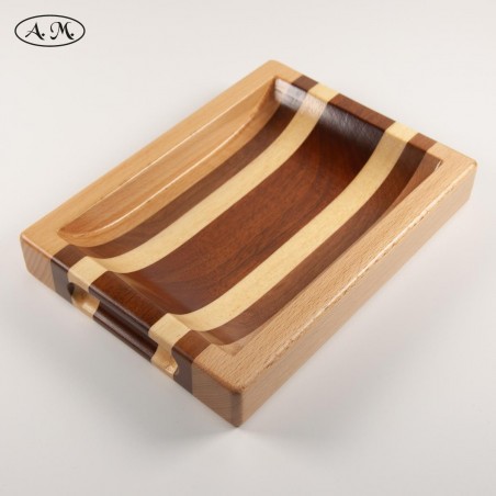 Rectangular shaped catch-all tray with finger slots. Made of natural beech, mansonia, koto and sapele.