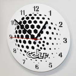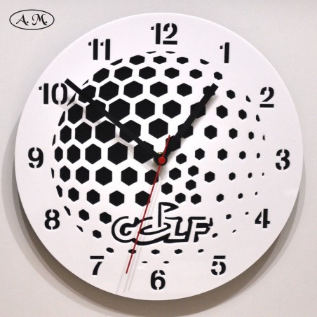 Wall clock with the design of a golf ball. Made of acrylic and polypropylene. in 28cm diameter