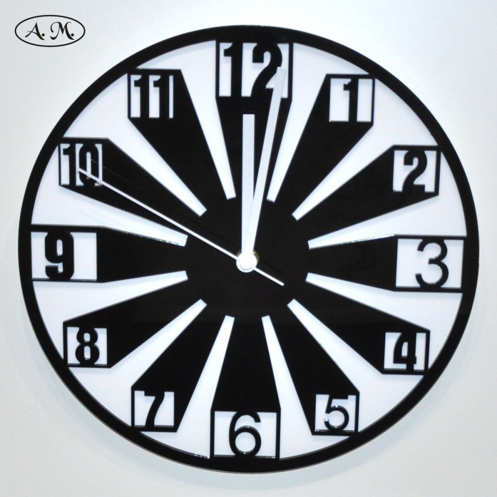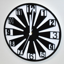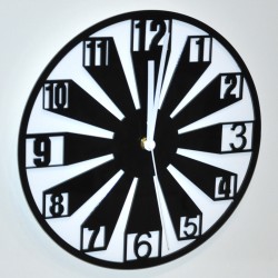 Wall clock made by hand with 3 mm thick black acrylic on the front, and 2 mm thick white acrylic on the bottom.