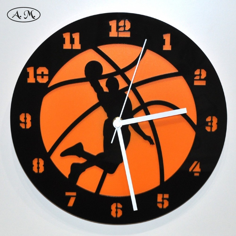 Wall clock made by hand with 3 mm thick black acrylic on the front, and orange polypropylene on the bottom. Basketball inspired design.