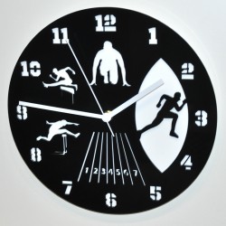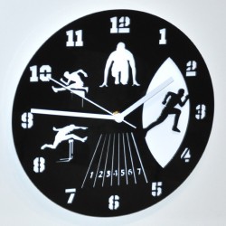 Wall clock with design based on the running athletics events. Made of acrylic. in 28cm diameter