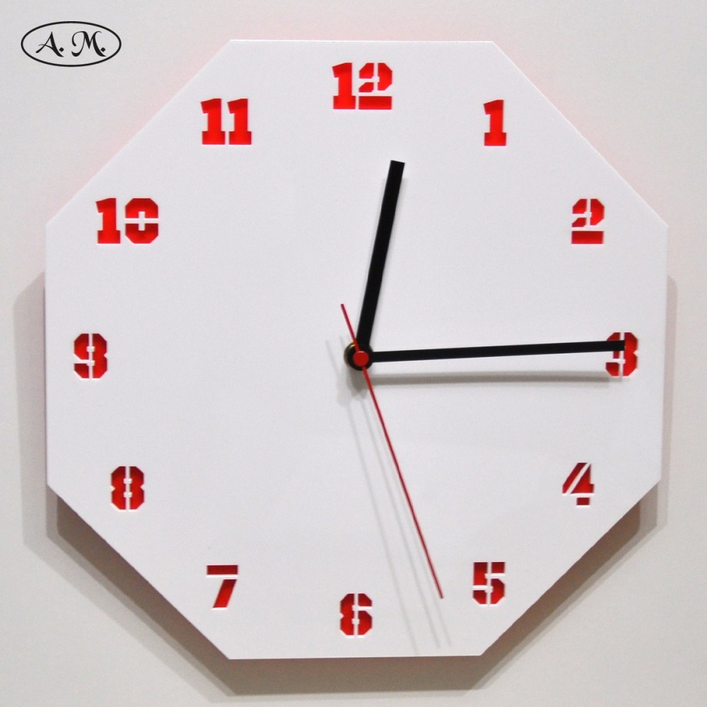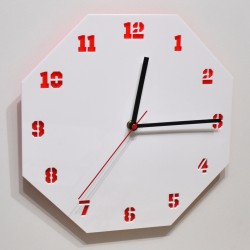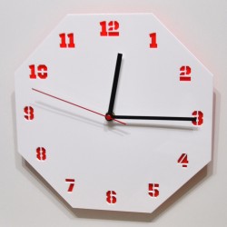 Wall clock made by hand with 3 mm thick white acrylic on the front, and red polypropylene on the bottom. octagon inspired design.