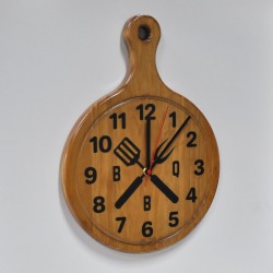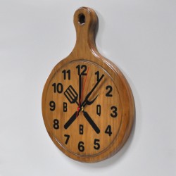 Wall clock inspired by a cutting board and with barbecue motifs. Made of natural pine wood stained in walnut color and epoxy resin. In 40x29cm.