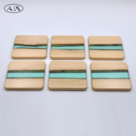 Coasters handcrafted from natural pine wood filled with epoxy resin and finished with a high hardness varnish. River effect design in traslucent blue color.