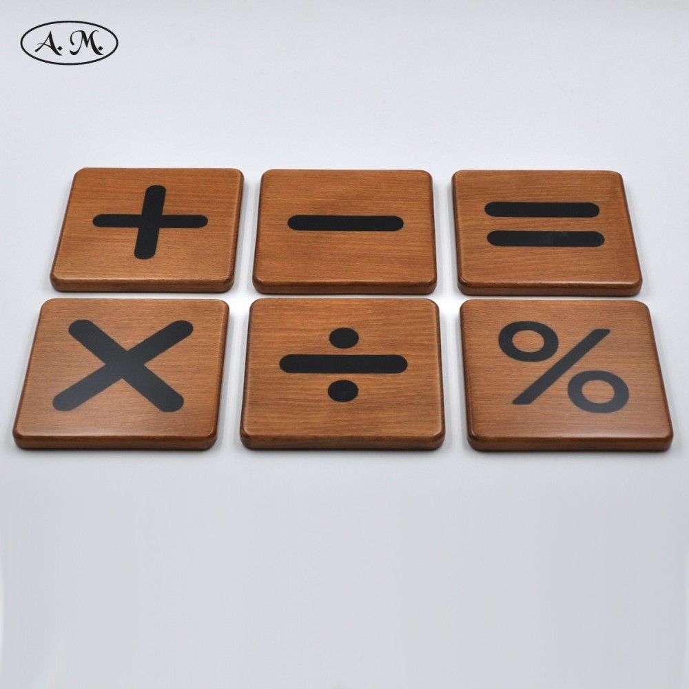 Coasters with math symbols, made of natural beech wood stained in walnut color and epoxy resin.