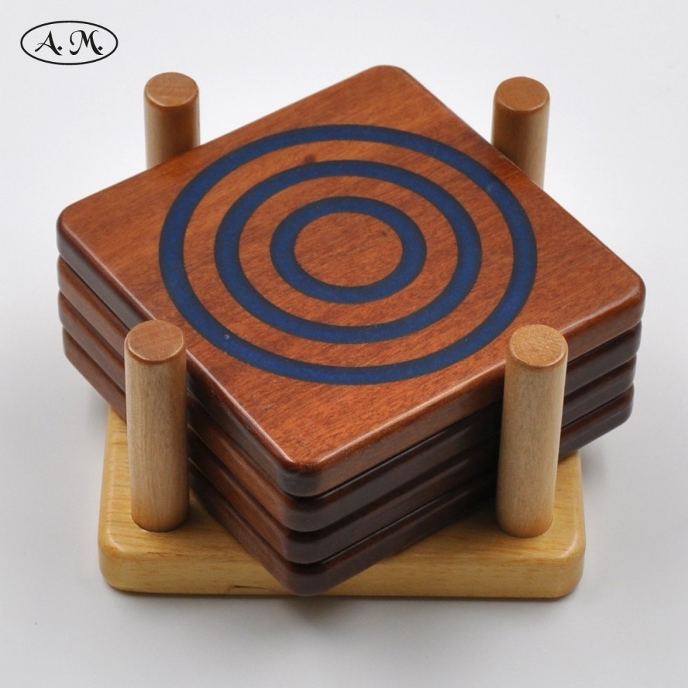 Coasters handcrafted from natural danta wood filled with epoxy resin and finished with a high hardness varnish. Design of concentric geometric figures.
