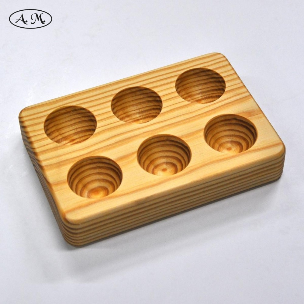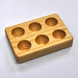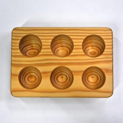 Cutting board made by hand with natural pine wood. Edge-grain design. Finished with natural mineral oil and our preparation with beeswax. On one side it is completely flat, and on the other it has six cavities to hold eggs.