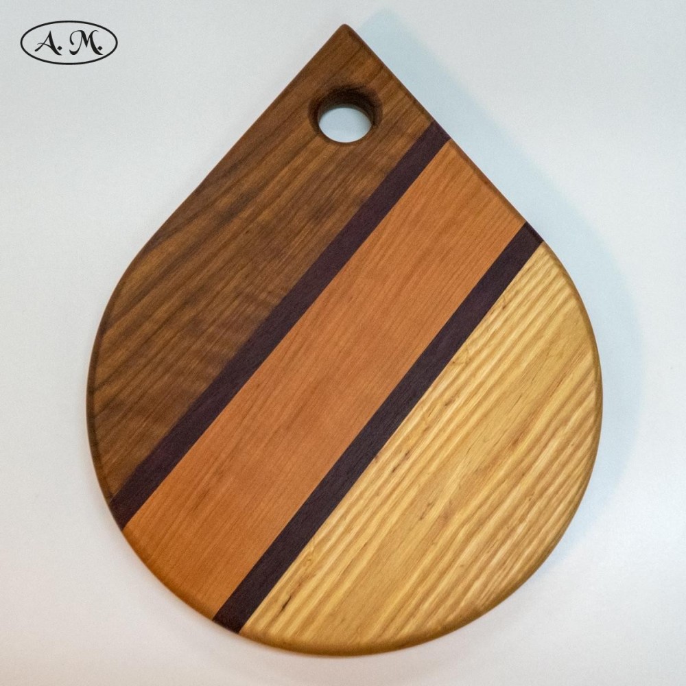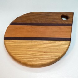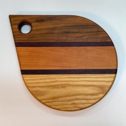 Tear drop shaped cutting board made with natural ovengkol, cherry, ash and purple heart wood.