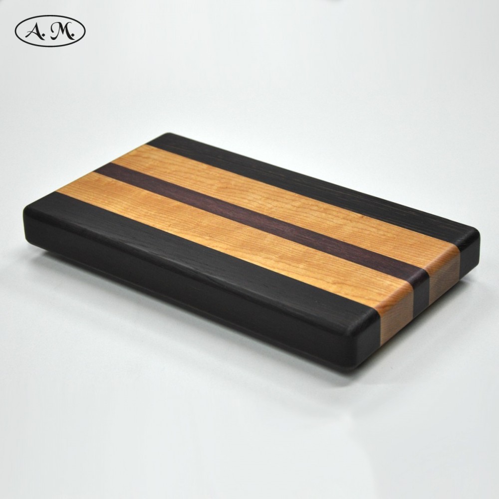 Cutting board made by hand with natural wenge, maple and puple heart wood. Edge-grain design. Finished with natural mineral oil and our preparation with beeswax.