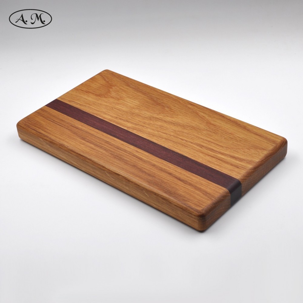 Cutting board made by hand with natural oak and purple heart wood. Edge-grain design. Finished with natural mineral oil and our preparation with beeswax.