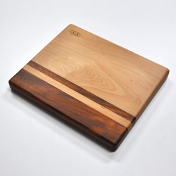 Cutting board made with natural beech and iroko wood.