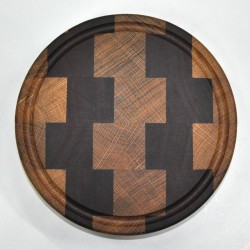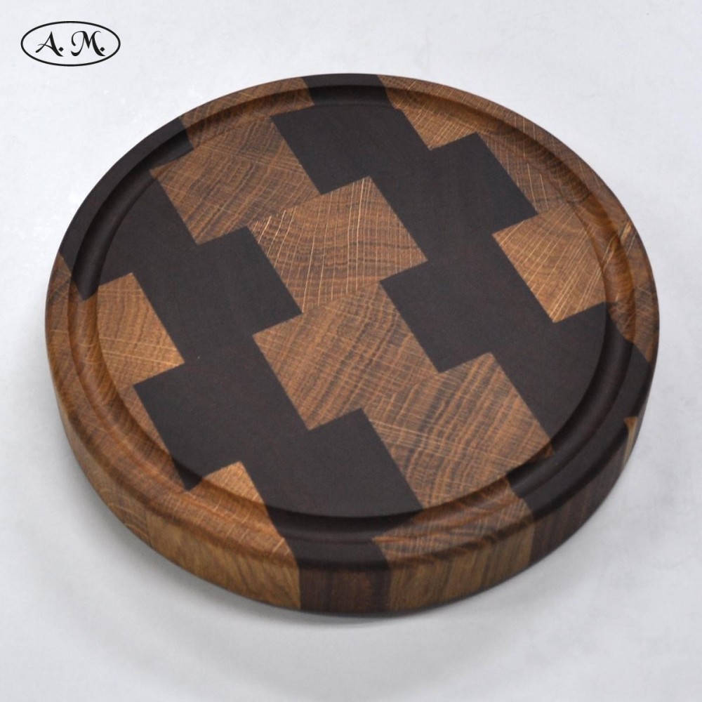 Cutting board made by hand with natural sapele and oak wood. End-grain design. Finished with natural mineral oil and our preparation with beeswax. On one side it is completely flat, and on the other it has a juice groove.