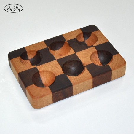 Cutting board made by hand with natural beech and kotibe wood. End-grain design. Finished with natural mineral oil and our preparation with beeswax. On one side it is completely flat, and on the other it has six cavities to hold eggs.