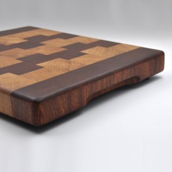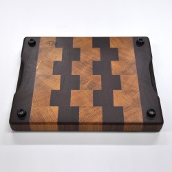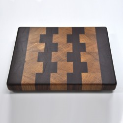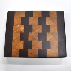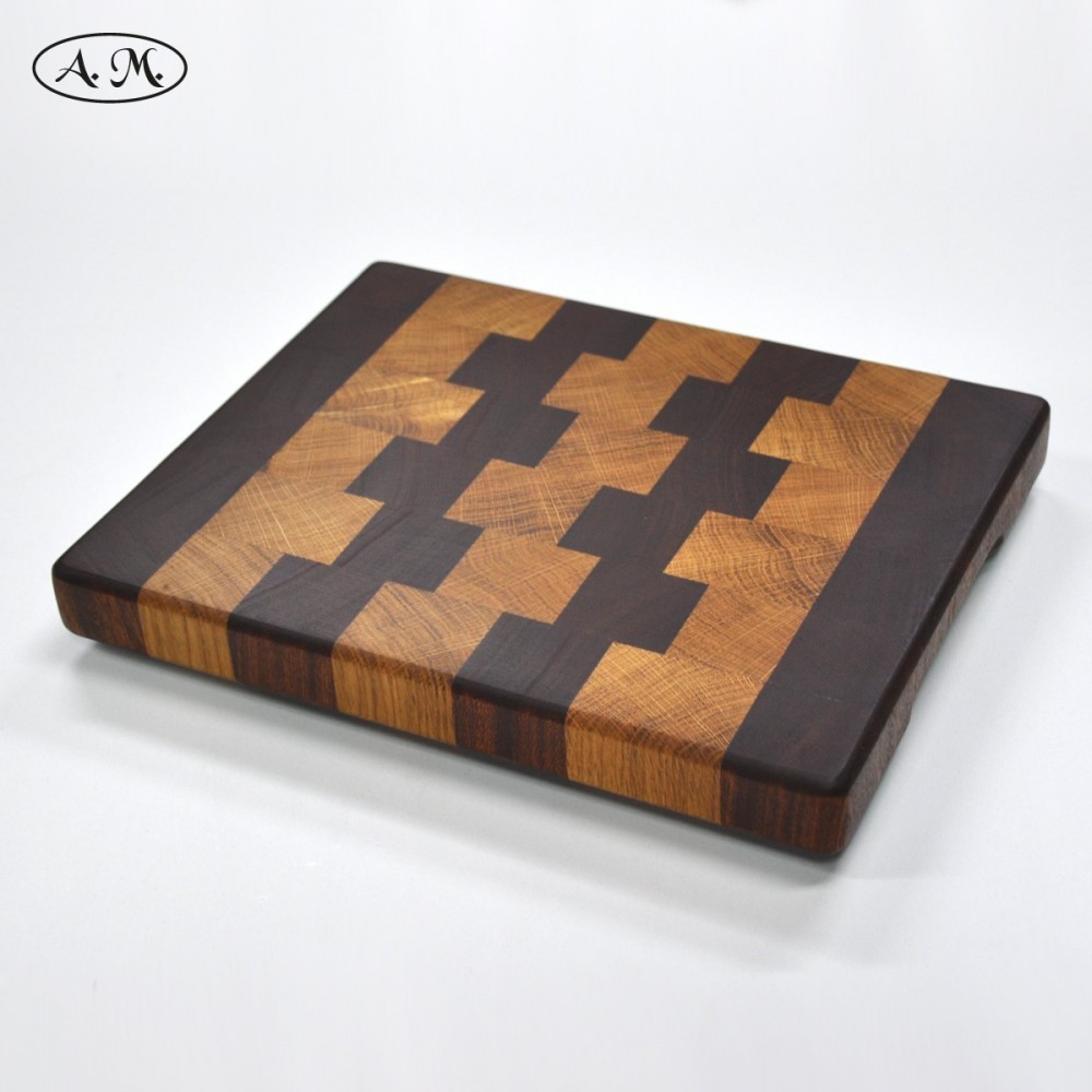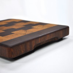 Cutting board made by hand with natural sapele and oak wood. End-grain design. Finished with natural mineral oil and our preparation with beeswax.