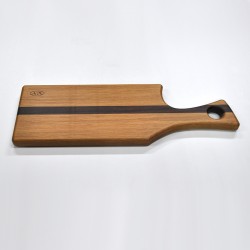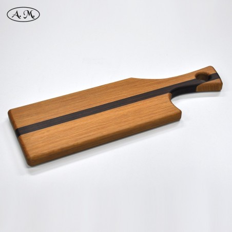 Cutting board made by hand with natural oak and ovengkol wood. Edge-grain design. Finished with natural mineral oil and our preparation with beeswax.