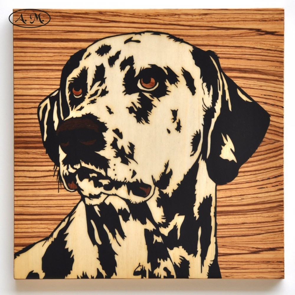 Handcrafted picture made by using noble wood veneers, and a Dalmatian head design. Varnished finish.
