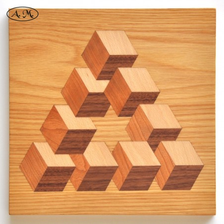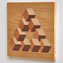 Picture of the Penrose triangle made up of cubes, made with different noble wood veneers. In 30x30cm.