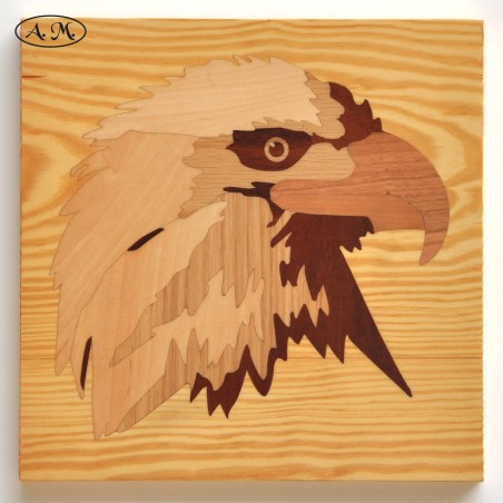 Picture of the head of an eagle over a light background, made with different noble wood veneers. In 30x30cm.