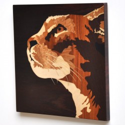 Picture of the head of a cat made with different noble wood veneers. In 30x30cm.