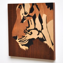 Handcrafted picture made by using noble wood veneers, and a tiger head design. Varnished finish.