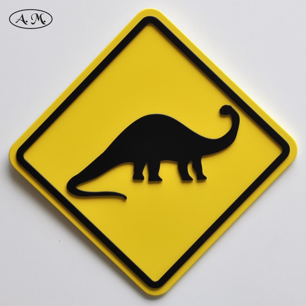 Cuadro fabricado a mano en tablero de fibras, con acabado lacado y con relieve, y diseño de señal de "aviso Diplodocus". Ideal para colgar en la pared en habitaciones infantiles. ¡Les encantará!