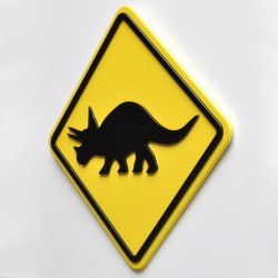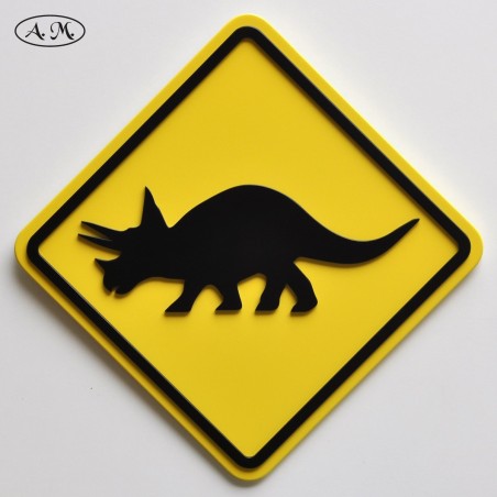 Cuadro de señal de "aviso Triceratops" fabricado en tablero de fibras y con acabado lacado y con relieve. En 40x40cm.