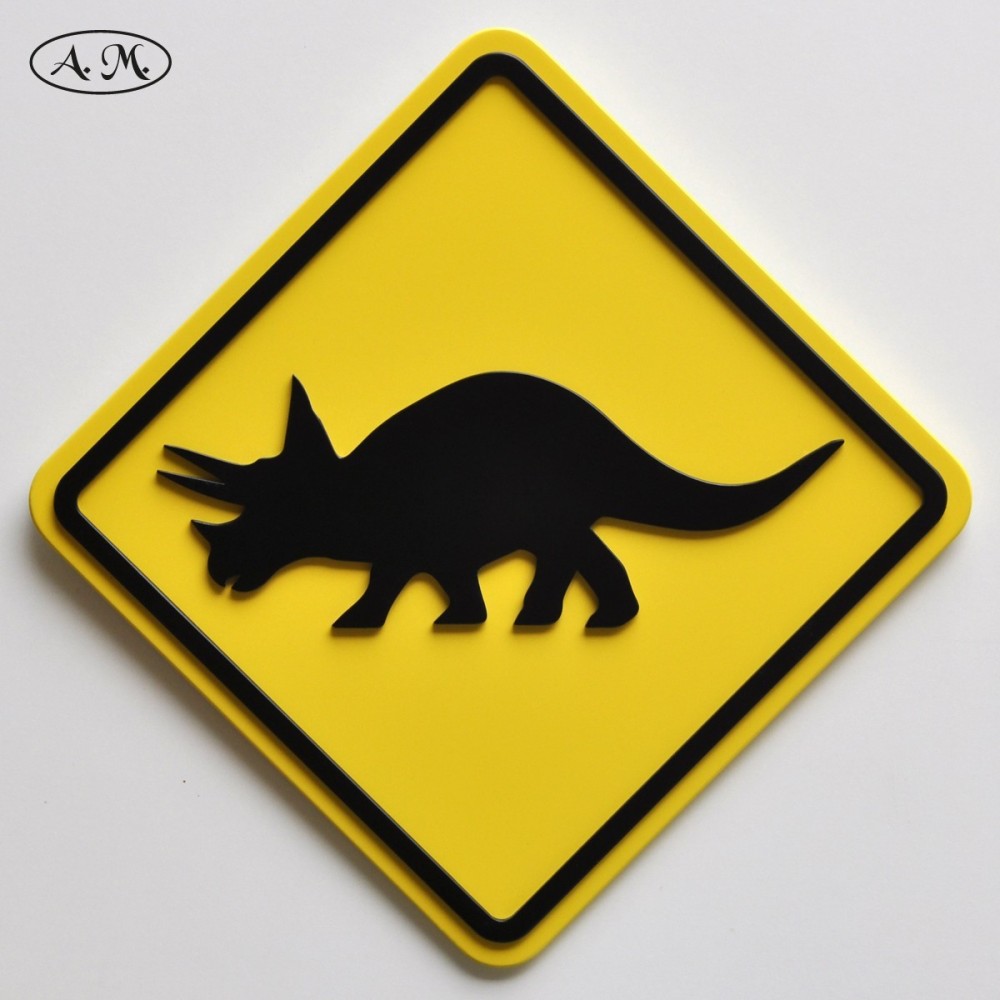 Cuadro fabricado a mano en tablero de fibras, con acabado lacado y con relieve, y diseño de señal de "aviso Triceratops". Ideal para colgar en la pared en habitaciones infantiles. ¡Les encantará!