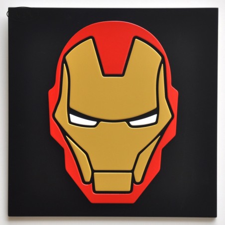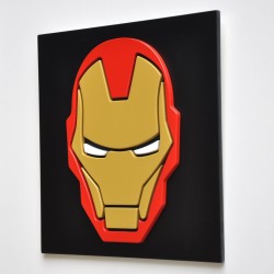 Cuadro fabricado a mano en tablero de fibras, con acabado lacado y con relieve, y diseño de Iron Man. Ideal para colgar en la pared en habitaciones infantiles. ¡Les encantará!