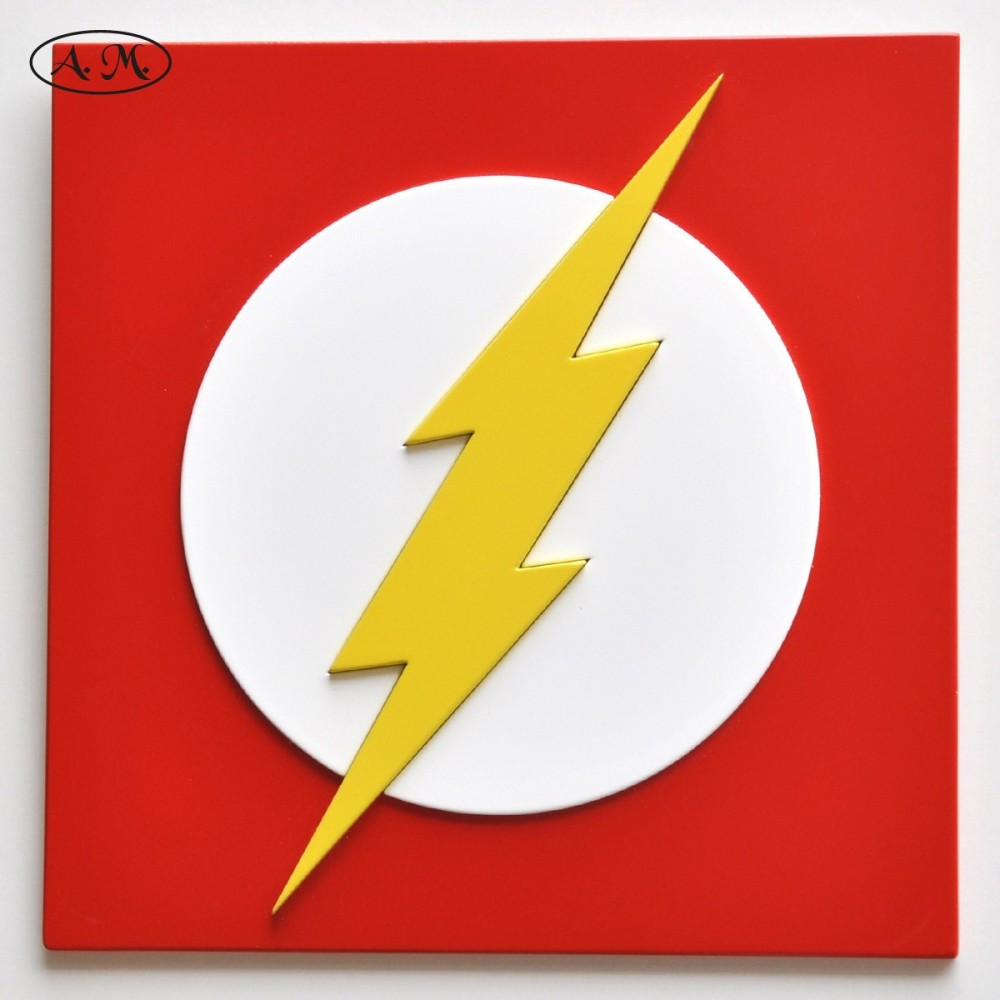 Cuadro fabricado a mano en tablero de fibras, con acabado lacado y con relieve, y diseño de The Flash. Ideal para colgar en la pared en habitaciones infantiles. ¡Les encantará!