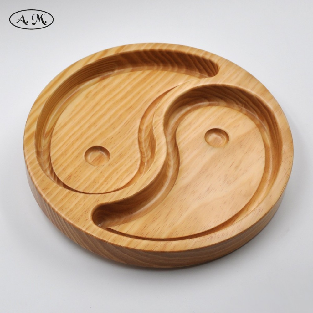 Bandeja multiusos fabricada artesanalmente en madera natural de pino. Diseño de yin y yang. Acabado barnizado.