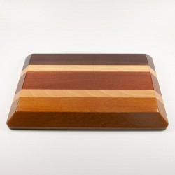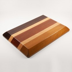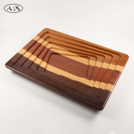 Bandeja multiusos fabricada artesanalmente en madera natural de iroko, haya, danta y mansonia. Diseño rectangular con Tessellation. Acabado barnizado.