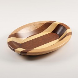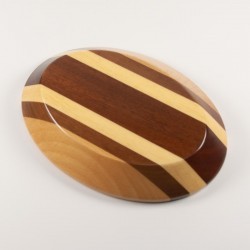 Bandeja multiusos fabricada artesanalmente en madera natural de haya, mansonia, koto y sapelly. Diseño ovalado. Acabado barnizado.