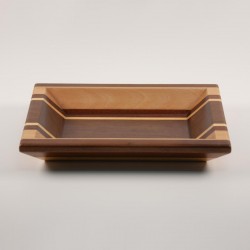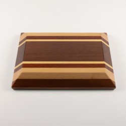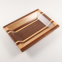 Bandeja multiusos fabricada artesanalmente en madera natural de embero, haya, sapelly, koto y mansonia. Diseño rectangular. Acabado barnizado.